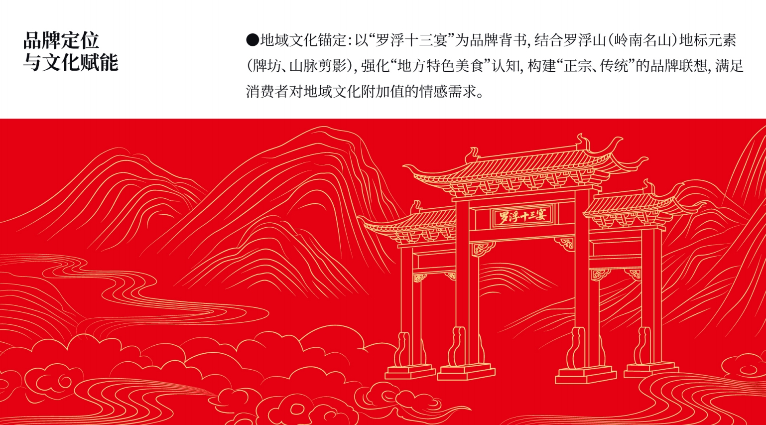 地域文化锚定:以“罗浮十三宴”为品牌背书,结合罗浮山(岭南名山)地标元素(牌坊、山脉剪影),强化“地方特色美食”认知,构建“正宗、传统”的品牌联想,满足消费者对地域文化附加值的情感需求。