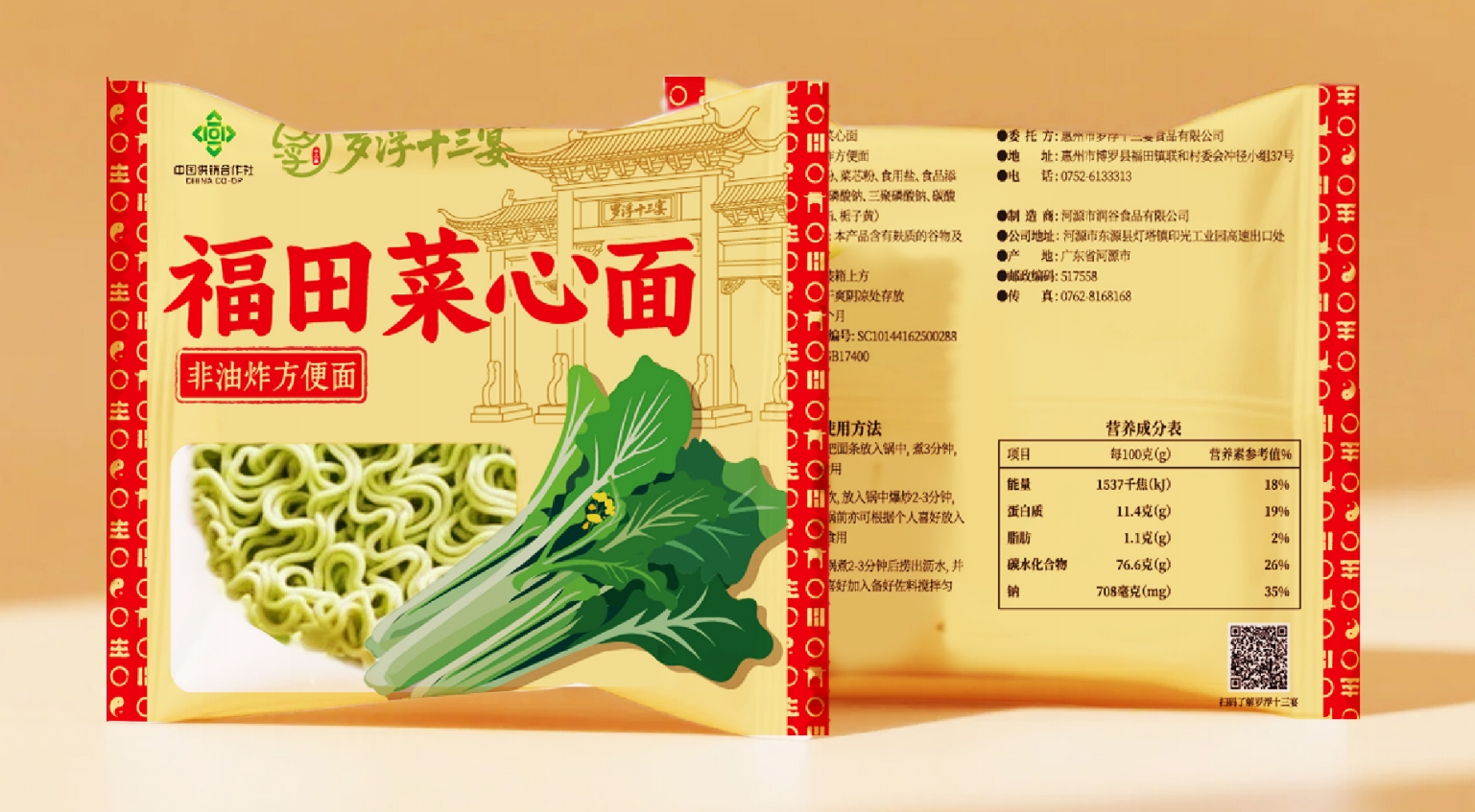 正面聚焦“福菜心田心面”品名+“非油炸”标签,辅以品牌Logo,核心卖点一目了然;背面采用卷轴式信息框,将产品资质(ISO认证、生产标准)、营养成分等理性信息结构化呈现,兼顾专业性与可读性。