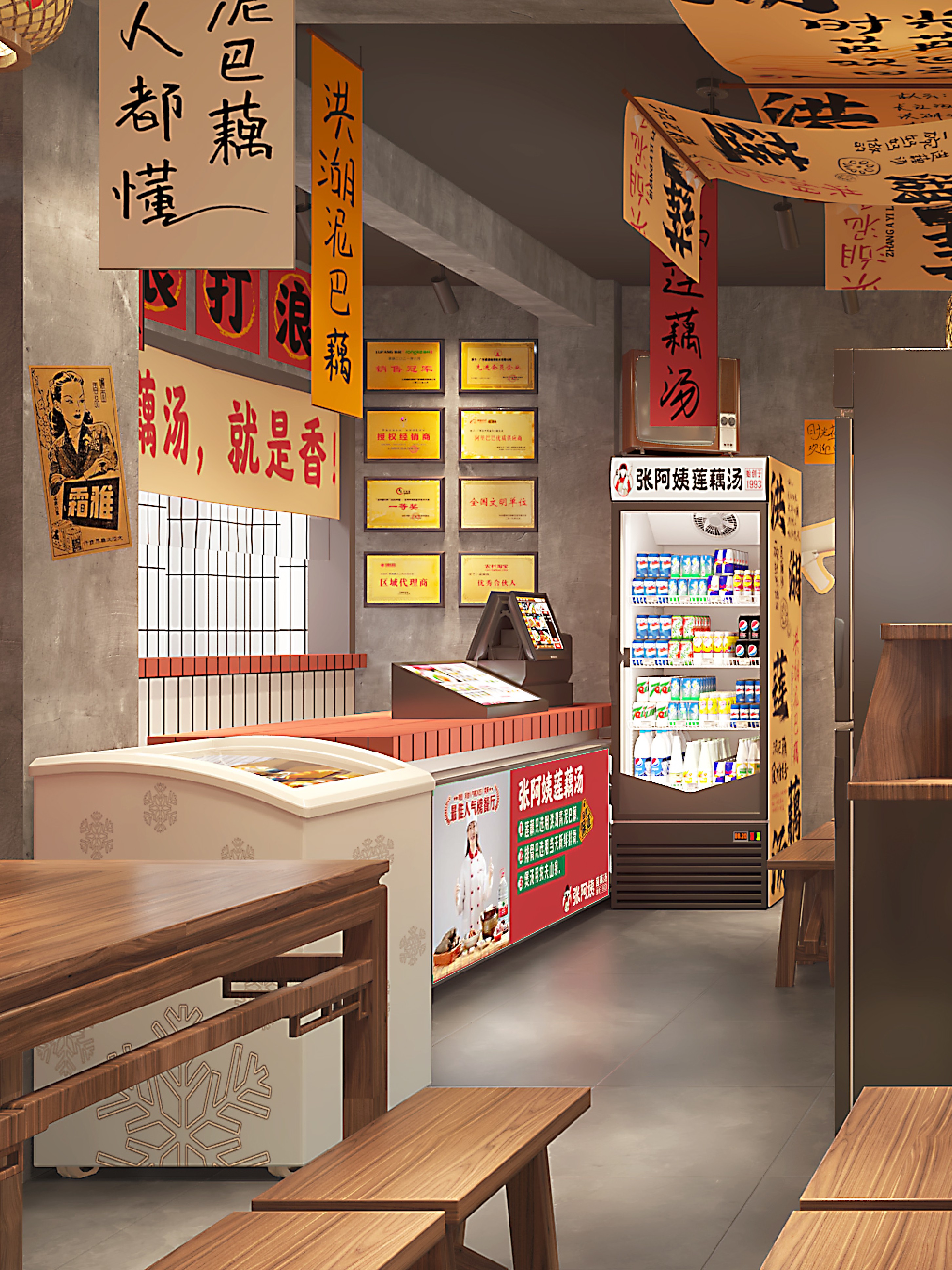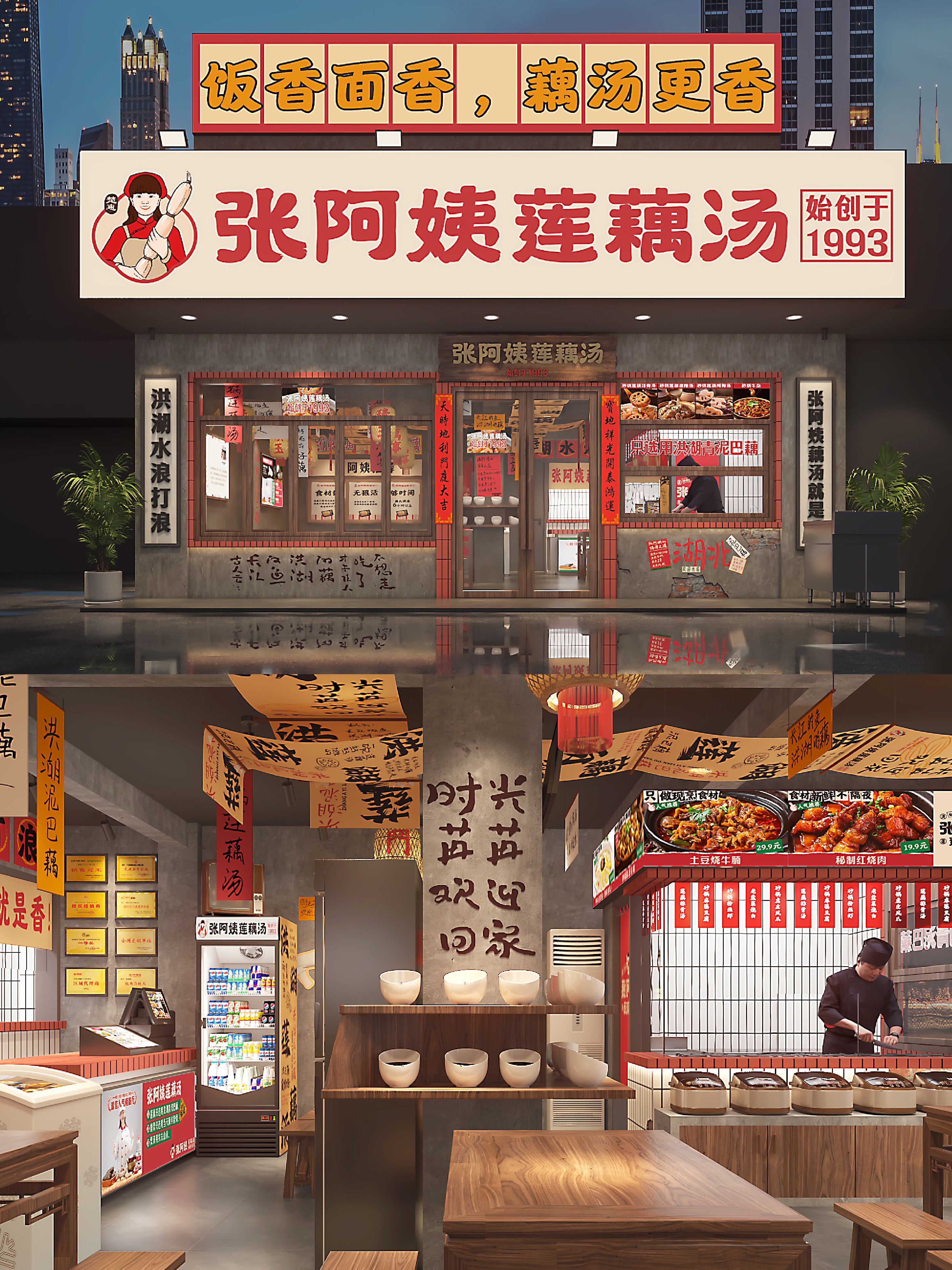 品牌门店设计为了让张阿姨门店更有年代感和市井气,避开对墙面色彩和材质的打造,选择更朴实的原始水泥质感作为门店主背景。门店两边以对联方式呈现,将品牌打造成“新潮老字号”。店内的墙面装饰、地面等也都以怀旧为主题营造出旧年代的氛围,用更多的毛笔字书写布幔作为吊顶,红灯笼作为氛围灯,消费者就餐其中,仿佛在80、90年代的市井小巷中穿行,能听到熟悉的嘈杂声,感受到丰富多彩的文化气息。